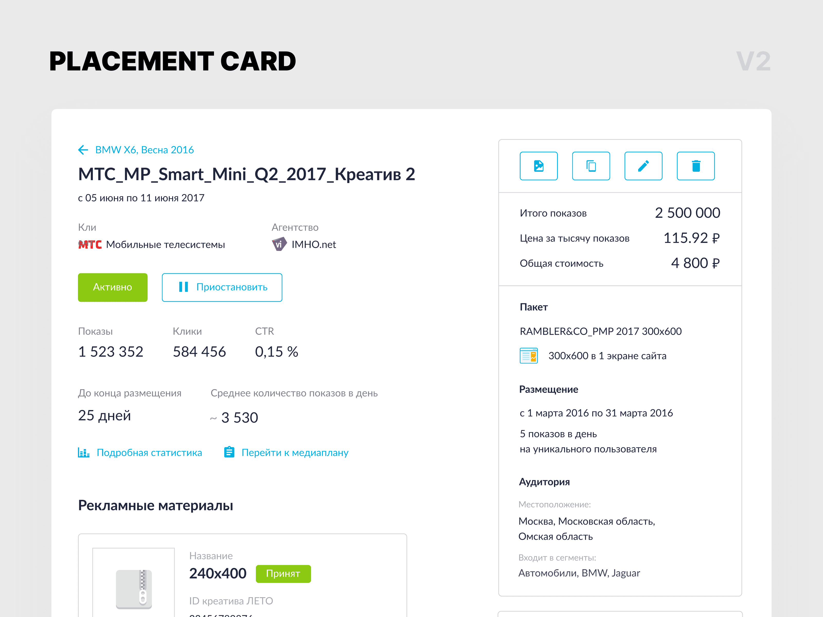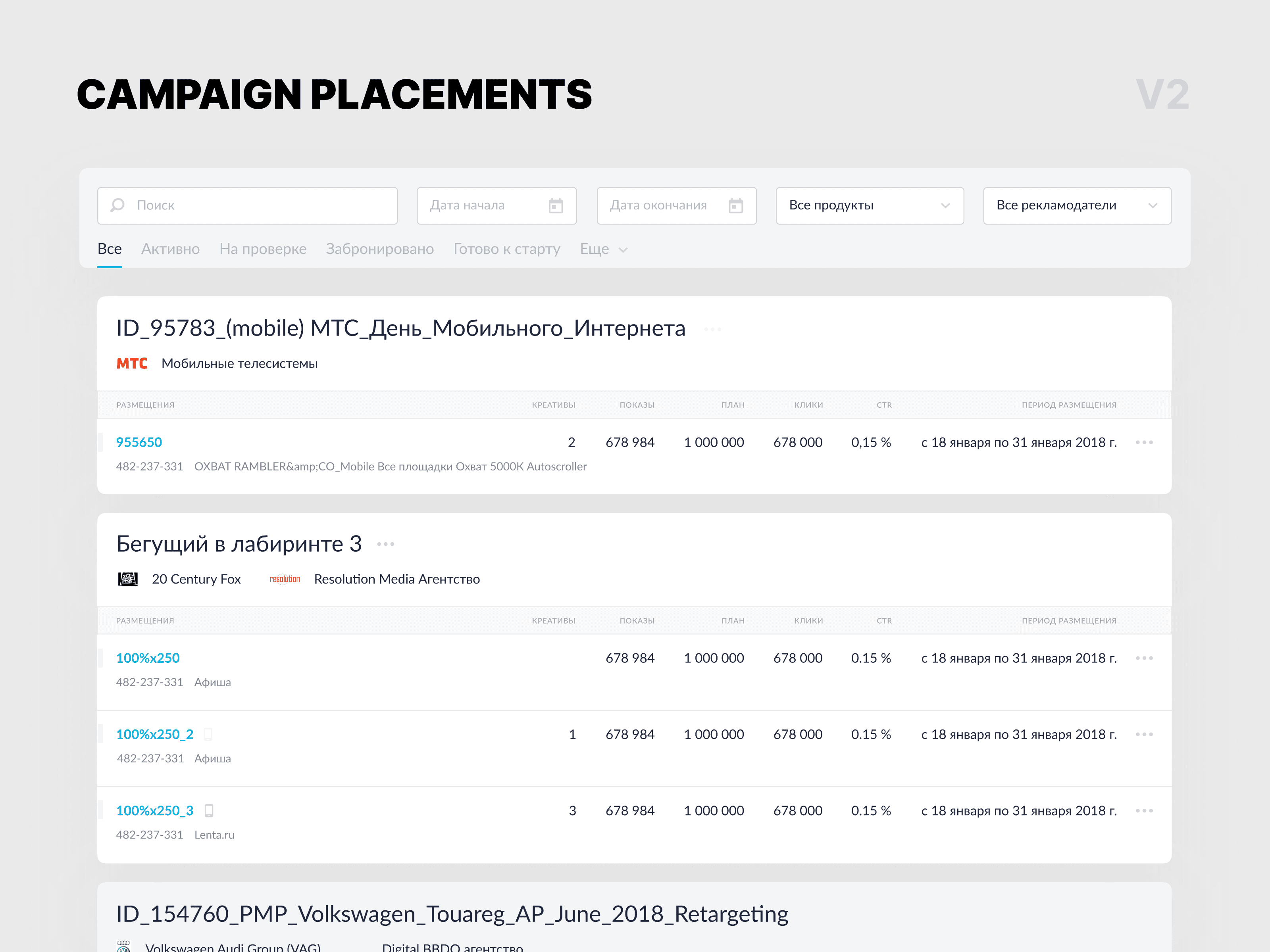 Conducted competitor analysis to benchmark key UX patterns in ad management platforms. Audited the existing interface to identify pain points in campaign setup, placement tracking, and reporting. Held numerous interviews with active users of the platform (internal staff, advertising agencies). Developed a design system with scalable components for campaign boards, analytics dashboards, and placement cards. Introduced consistent typography, improved data visualization, and adaptive layouts for desktop and mobile.