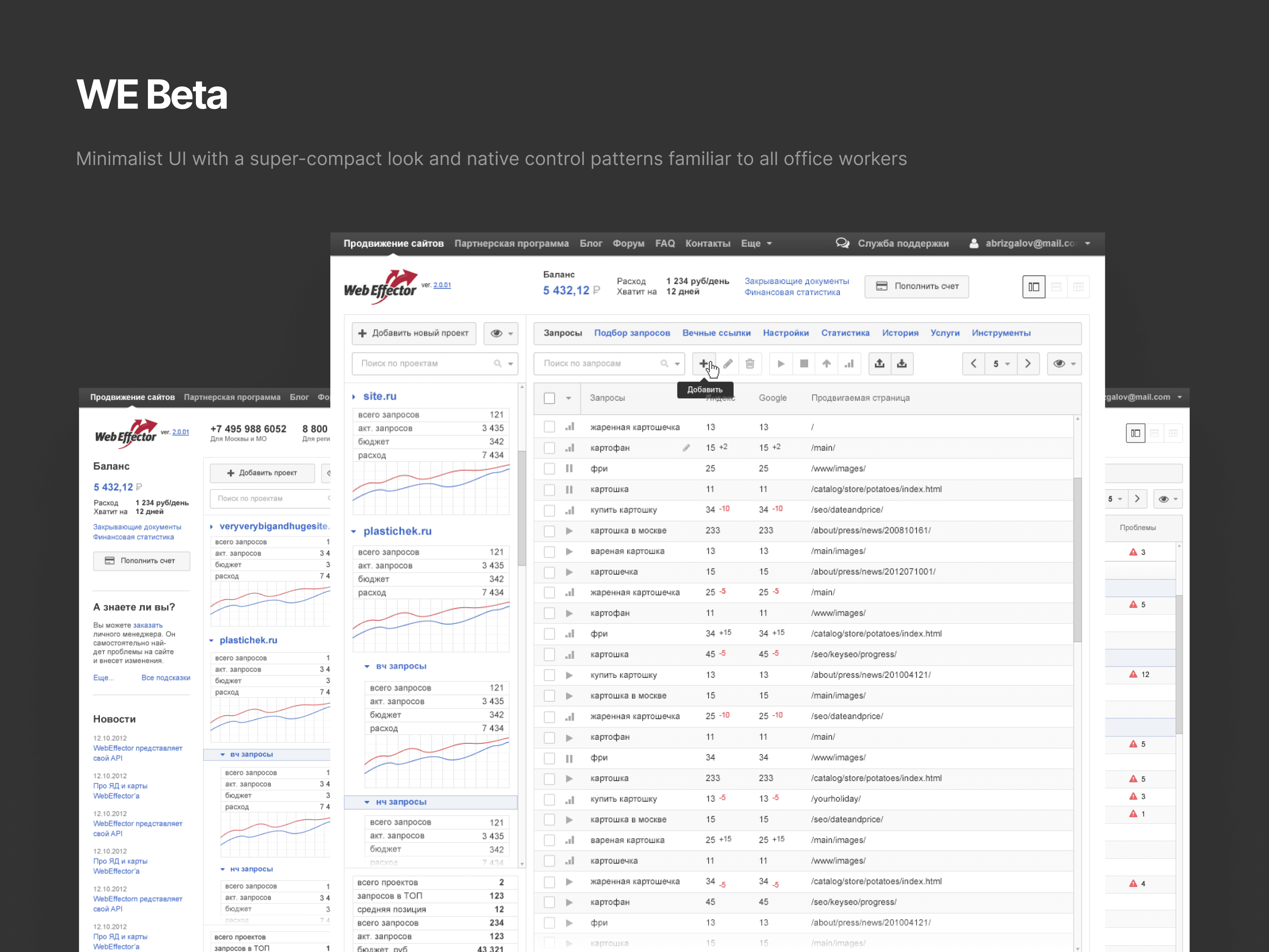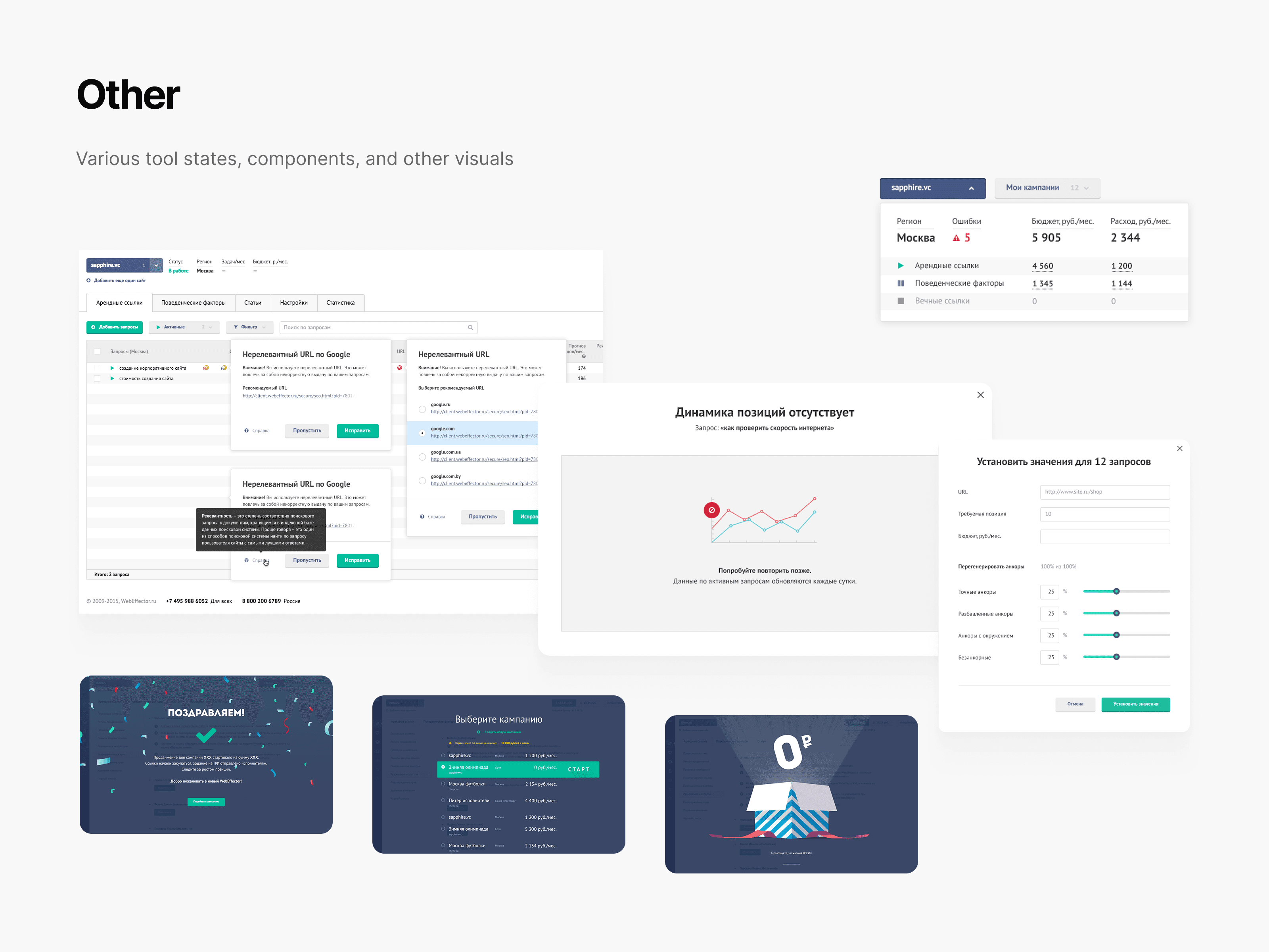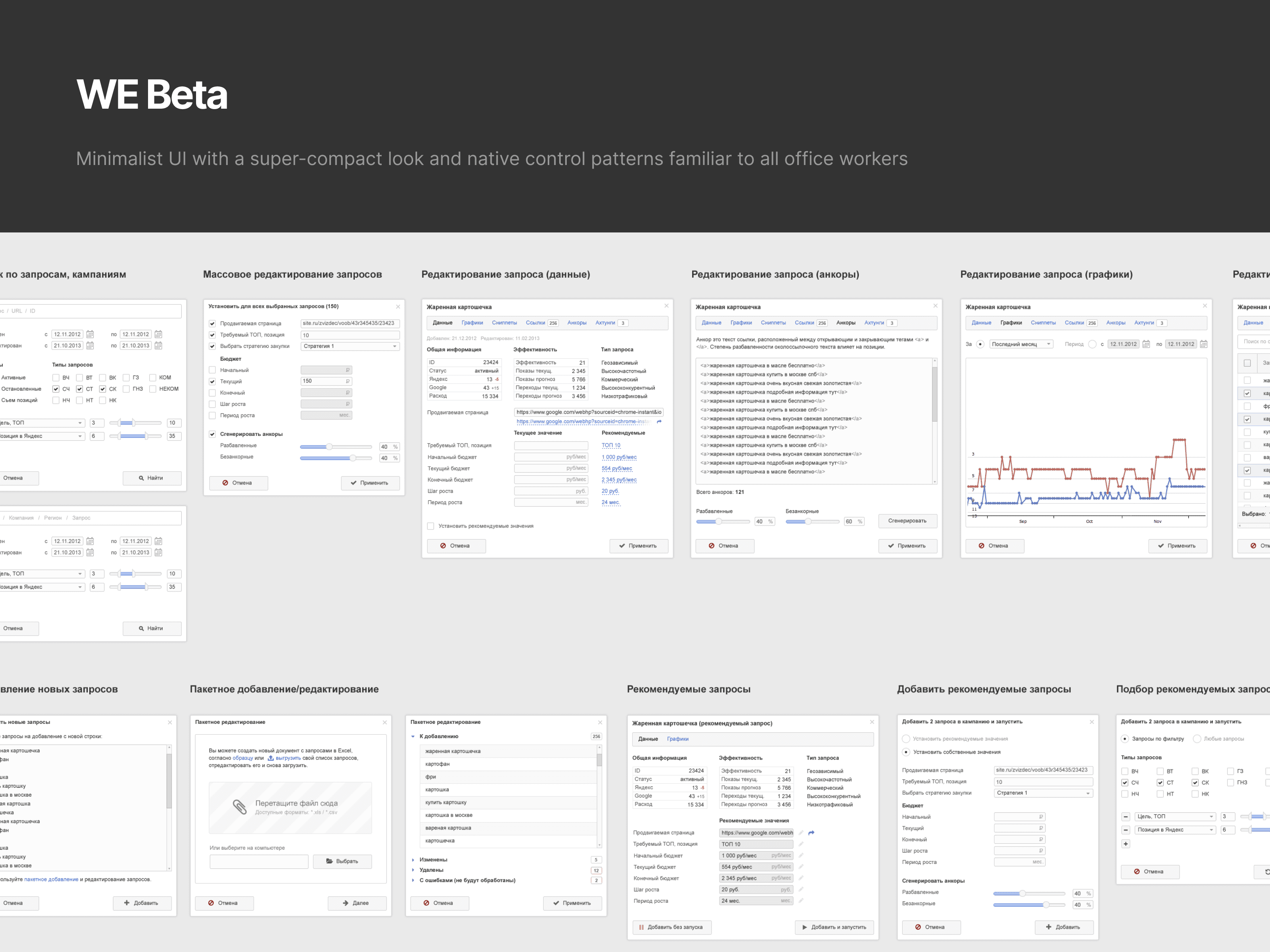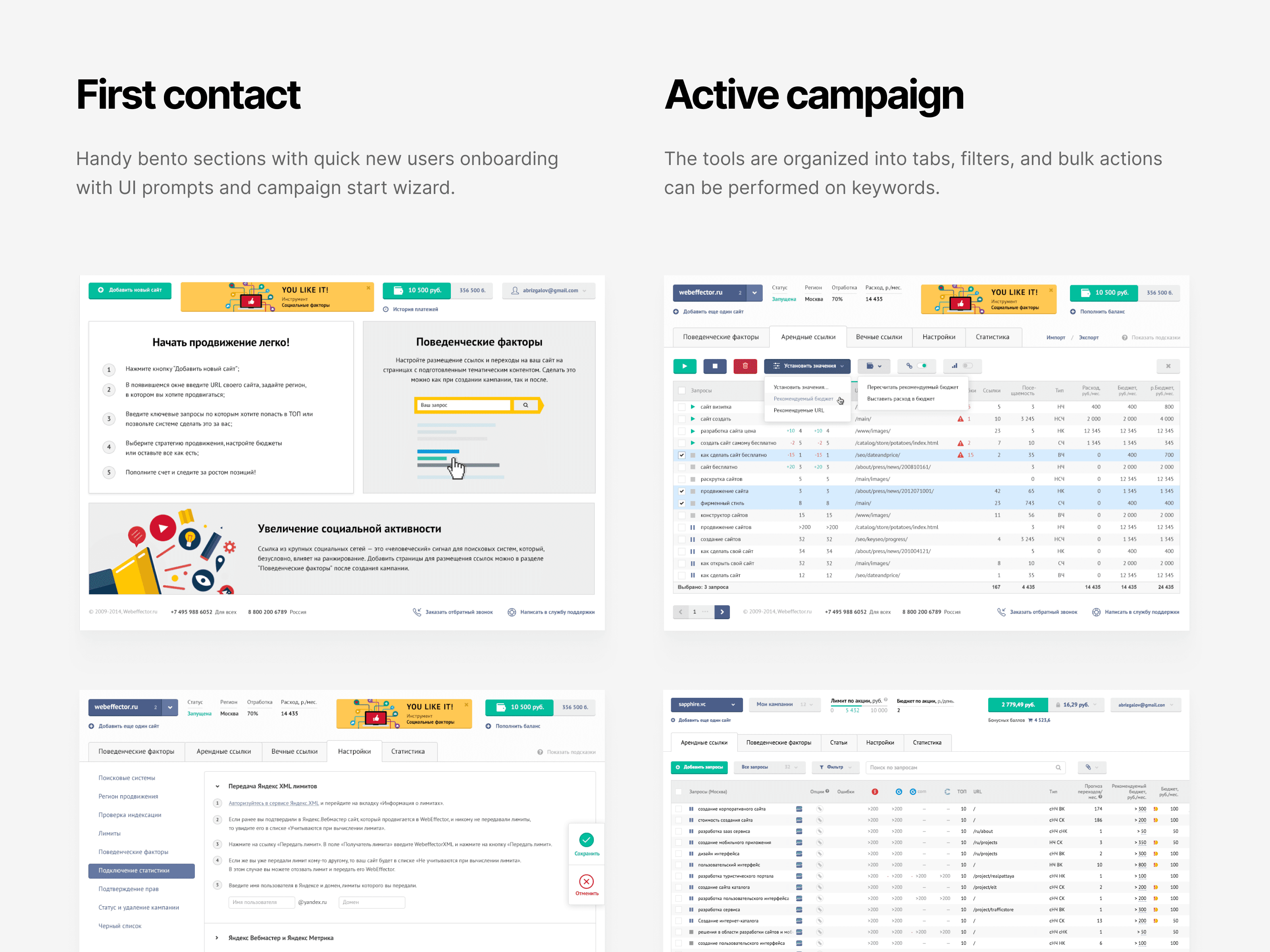 Redesign and evolve a SaaS platform for automated SEO and digital marketing management. The goal was to modernize the product experience for agencies and SMB clients, improve campaign transparency, and make complex analytics more accessible through intuitive dashboards and modular UI patterns.